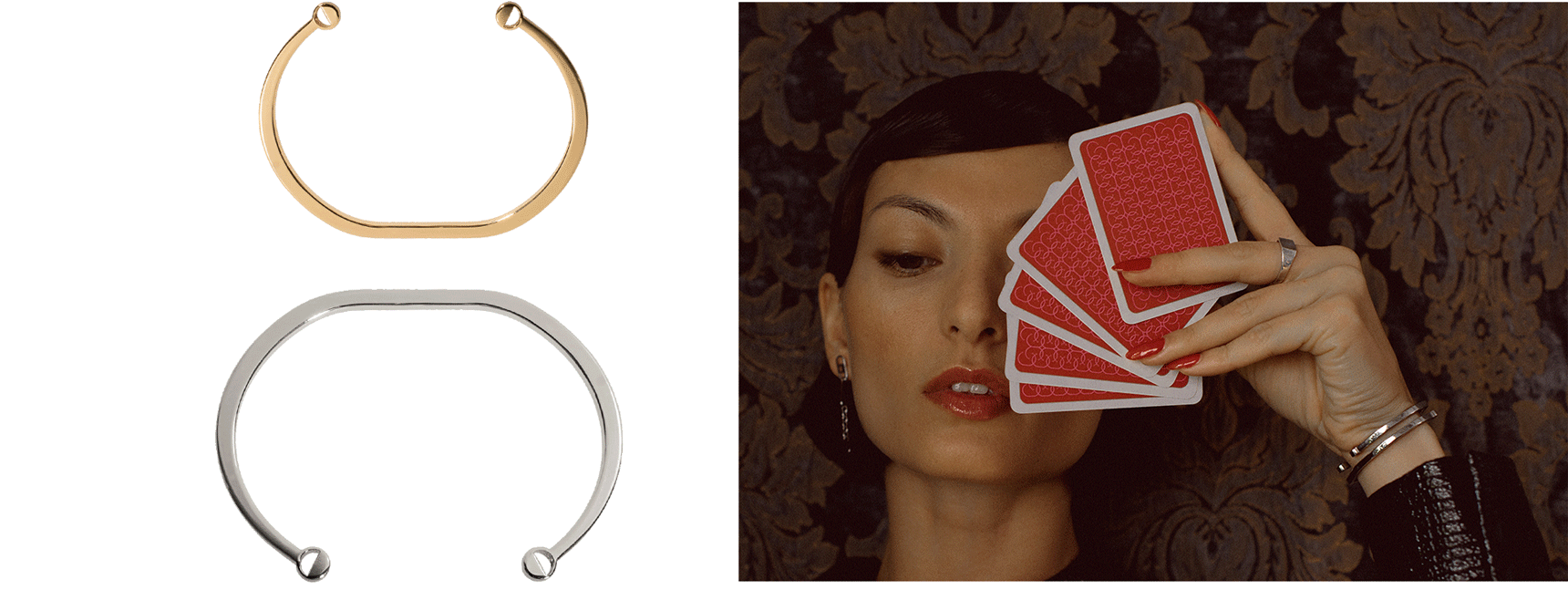 Wir haben uns Fragen gestellt und diese durch die Pieces unserer neuen Kollektion „Bond“ beantwortet. Die geometrischen Grundformen, wie sie auch im Glücksspiel zu finden sind, haben wir als Orientierungspunkte genutzt. Während sich beim Roulette Kreise geschmeidig um ein Zentrum drehen, schmiegen sich unsere Armspangen durch eine Rotation elegant um das Handgelenk.