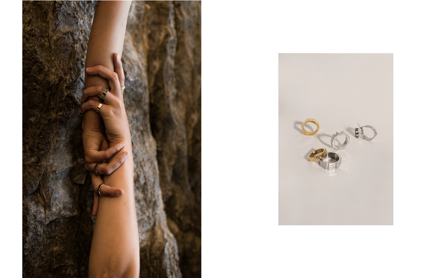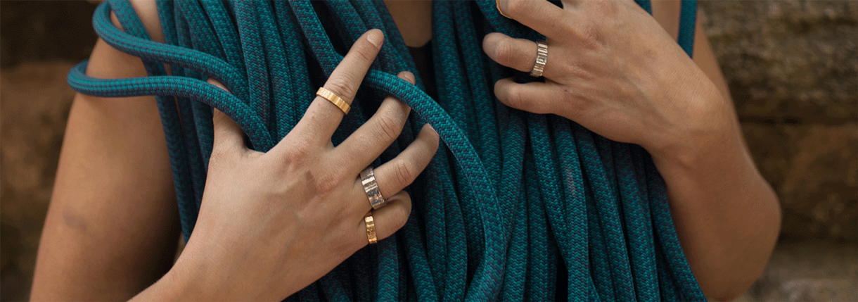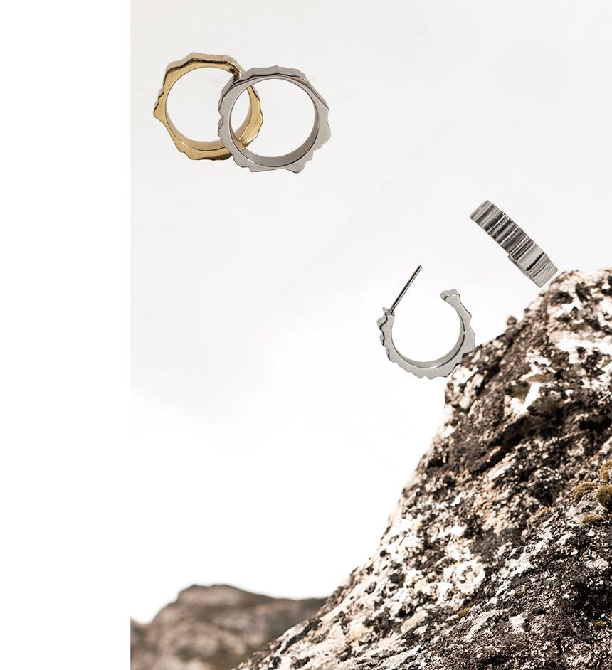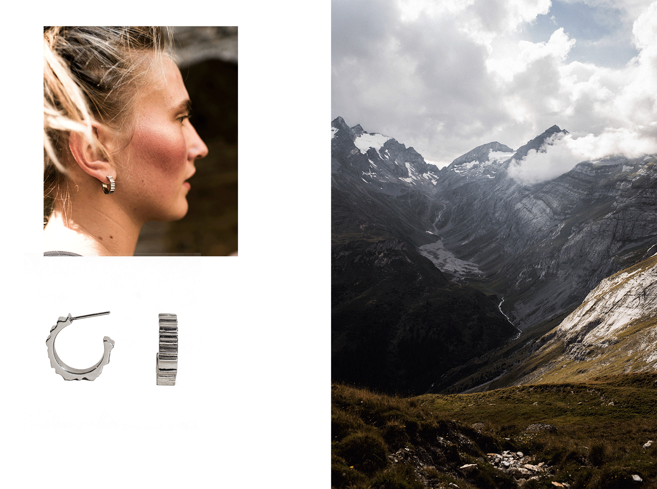 Die Kollektion Monti ist den Alpen gewidmet. In den Schmuckstücken lassen sich verschiedene Bergketten wiederfinden. Die Silhouetten der Berge schmiegen sich um Deine Finger oder hängen wie Felsvorsprünge an Deinen Ohren.